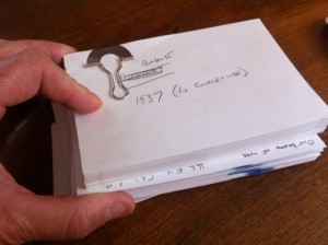 Here's the "August 1937 to source and use" card stack that became Chapter 8, "Things Fall Apart", about CNAC caught astride the outbreak of the Sino-Japanese War. The cards at the bottom whose top edges are marked in blue are the research morsels that I ended up using in the story. The unmarked ones on top are the tidbits that never found a home. They're about equal in volume.