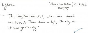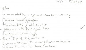 The line "food prices tripled" in the center of the page photographed below is the line created from the "Anna to Mother, CC Kitsi" card, and I confirmed the fact in one of my interviews with Moon Chin. (Or so says my endnotes…)
