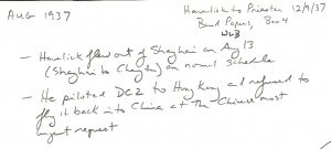 Here are described the actions of CNAC pilot Frank Havelick, taken from a letter to Andre Priester, the text of which was provided to me by Nancy Allison Wright. The DC-2 on this card became the "Hong Kong DC-2″, a massive bone of contention between Pan Am and CNAC's Chinese leadership in August, September, and October of 1937.