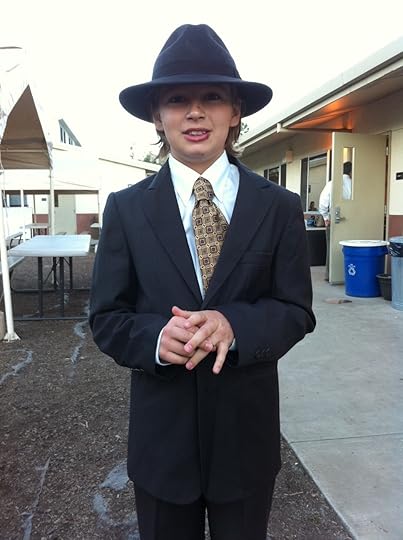 Today is the big day, so here's a picture of Ryan at school dressed as Bond, and I must say, Bond looked great among Jackie Robinson, Eleanor Roosevelt, Ghandi, Captain Cook, Abraham Lincoln, and many others. (Note Bond fiddling with his wedding ring.)