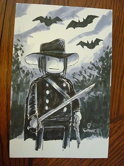 Those of you who follow me on Facebook or Google+ might remember me mentioning recently that the incredible Thomas Boatwright put together an awesome Playmobil conversion of Solomon Kane. Well, he went ahead and sold the conversion, and I was lucky enough to be the one to buy it. The package arrived yesterday, featuring not only Solomon Kane himself, but also a couple of pirates, a couple of Vikings, and an original sketch of Playmobil Solomon Kane, in all his glory.