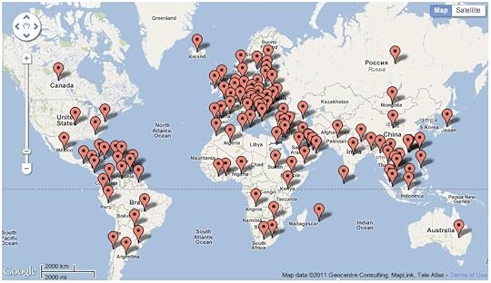 The above image is from the Feedbooks analytics of my book. Each mark represents a country where at least one person has downloaded my book. Granted it's not perfect, it looks like the states of GA and PA are considered countries for some reason.