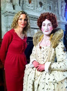 First, we explored how the young Elizabeth I created her image. Wanting to look pure and virginal, she favoured a natural, alabaster look. To make her skin pale, she used the best quality ingredients around, namely, white lead and vinegar. Sally brought real white lead with her – I'm sniffing it here, it smelt awful! – but in the interests of health and safety, we used reproduction lead on our model's face (an actress and interpreter from Past Pleasures).