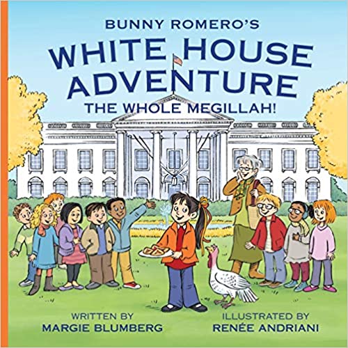 New to the USA from Mexico, young immigrant Bunny Romero has a dream. An unusual one, to be sure, but it is her dream. Bunny wants to visit the White House, but more than that, she wants to eat her favorite cookies – her Mexican nana’s Hamantashen – in the White House kitchen. It sounds impossible, but then the unexpected happens – Bunny’s second-grade class will be touring the White House just before Thanksgiving! However, is the kitchen a part of the tour of the White House? Join this young dreamer in Bunny Romero’s White House Adventure: The Whole Megillah! by Margie Blumberg and find out if Bunny can make this very special dream come true. The book includes a glossary of different words and their pronunciations right up front which I think is an excellent idea, preparing the reader in advance for understanding the meanings. Languages included are Spanish, English, Yiddish, Hebrew, and English. The author has interspersed them throughout the text in a very natural way. The illustrations by Renee Andriani are absolutely delightful and so detailed that one could almost follow the story with the imagery alone. The double-page chaotic search scene when everyone looks for Bunny will have parents nodding their heads.
