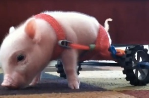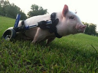 Chris P. with training wheelsThis little piggy was born with deformed hind legs, which means he lifts himself up on his front legs. While he is little, this modus operandi will work, but not later when he grows to full weight. His new owner modified his son’s toys to give Chris P. his first set of wheels. As the piggy grows heavier, he’ll graduate to bigger and better wheels. For many animals, life would be over, but for Chris P., life and a new role has just begun. His YouTube videos and his television appearances show him to be a curious, affectionate, independent and very intelligent piglet, with loads of personality and a secret obsession with grapes.Chris P. says on his Facebook page: My name is Chris P. Bacon. I am a pig in a wheelchair. My veterinarian Dr. Len Lucero decided that I needed to be given a second chance. I went home with Dr. Lucero that day, so that I would have a chance at life as a handicapped pig. I live in Florida and love my new life! Watch me grow and take on new obstacles that life has to offer me. Thanks for sharing it with me!
