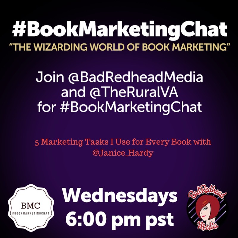 I'm doing a Twitter Chat tonight with Bad Redhead Media, talking about the five marketing things I do with every book. I'll share what I do, how I get organized, and where to start marketing your book.