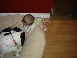 On our first day after moving to Colorado, we decided to lock her in an empty bedroom when we went out for dinner. When we came home she greeted us at the door. Upon inspection, we found that she had eaten/torn her way through the door itself making a hole large enough to get through. The next day we left her alone in that house to go to church and we decided to put her on a chain in the backyard. She broke the chain from the tree it was tied to, made a hole in the fence, and was exploring the neighborhood when Animal Control picked her up. We arrived in time to negotiate her release.