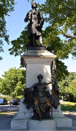 I didn’t know who she was, at first: some generic Greek-mythological nymph, I thought. There’s quite a tradition of placing decorative female figures (which I’ll call FFs, from now on) below statues of male politicians. I had read somewhere, years before, that the FFs embodied aspects of the politician’s best-known leadership qualities. Well. If that is indeed the case, Macdonald (or “John A”, as he’s familiarly known in Kingston) was primarily celebrated for an imperious gaze, carelessly worn togas, and very large breasts.