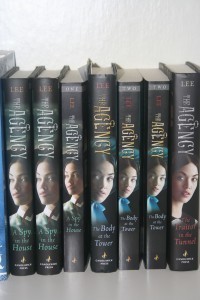 Finally, here's the bit of the cover that I always have trouble visualizing, even after seeing an electronic version of the cover: what the spine looks like, lined up with the others.