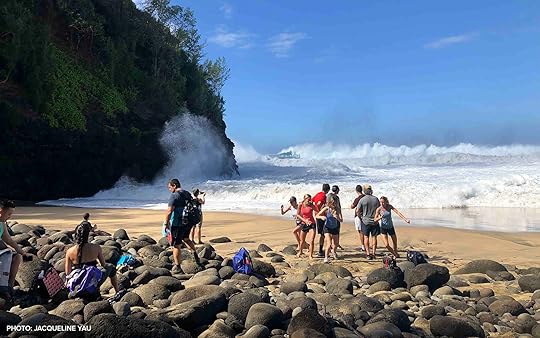 “Get ready to run,” I said to my wife as we watched a muscular swell gain momentum shortly after noon Monday at Hanakapi‘ai Beach. A second later the water was up to our ankles, then instantly above our knees, higher than our waist. Then we were under water, entirely submerged…”