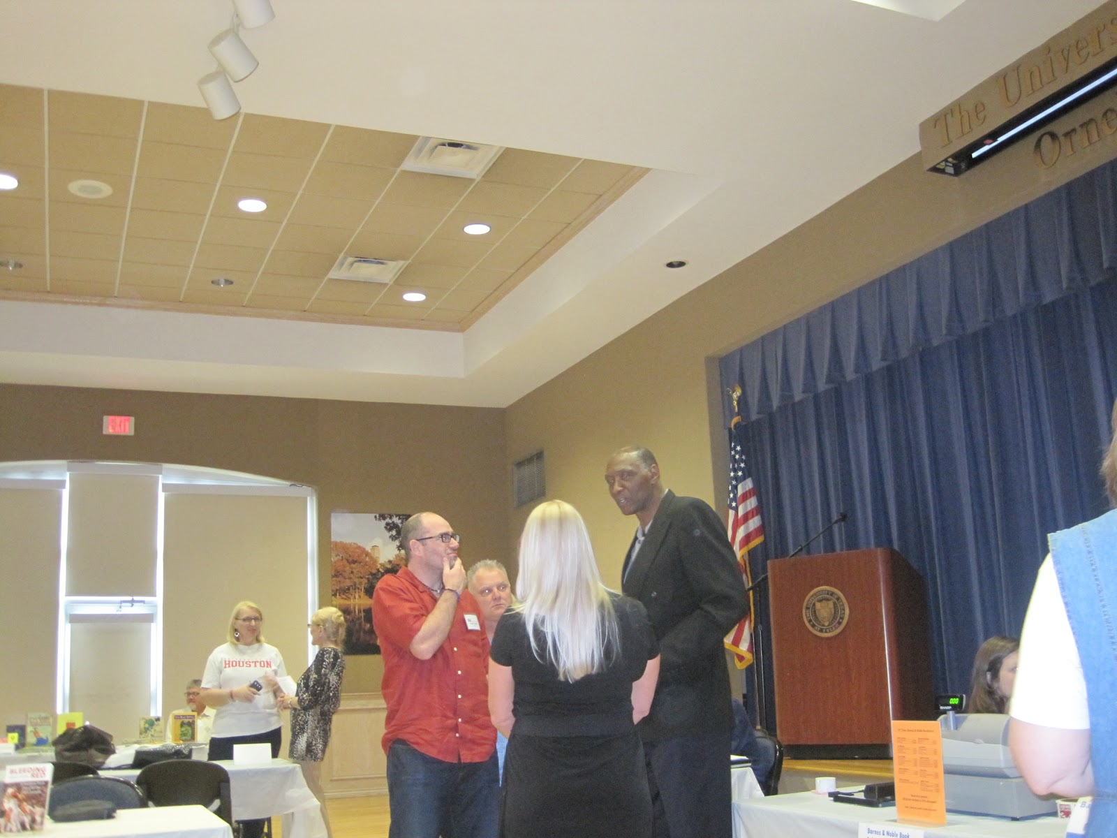 I must working. But before I dig in, a few pics from the East Texas Book Festival this past weekend. Drove northeast to Tyler, Texas with fellow Houston writer Marianne Dyson where we and Laura Edge and my bestest Austin buddy Varian Johnson and also Austin's Keith Graves were featured speakers. Basketball Hall of Famer Elvin Hayes gave the opening remarks. Much fun and talking to readers followed for the day, plus great food and gracious East Texas hospitality, including a lovely author reception the night before with many varieties of cheese balls and wine and other tasty stuff. It's a 3 hour-ish drive through the backroads from here -- past towns like Trinity and Lovelady and Palestine (pronounced Palisteen)-- but then boom, you're in Tyler and at the UT Tyler campus and a city that I think was actually the Texas capital for a brief bit.