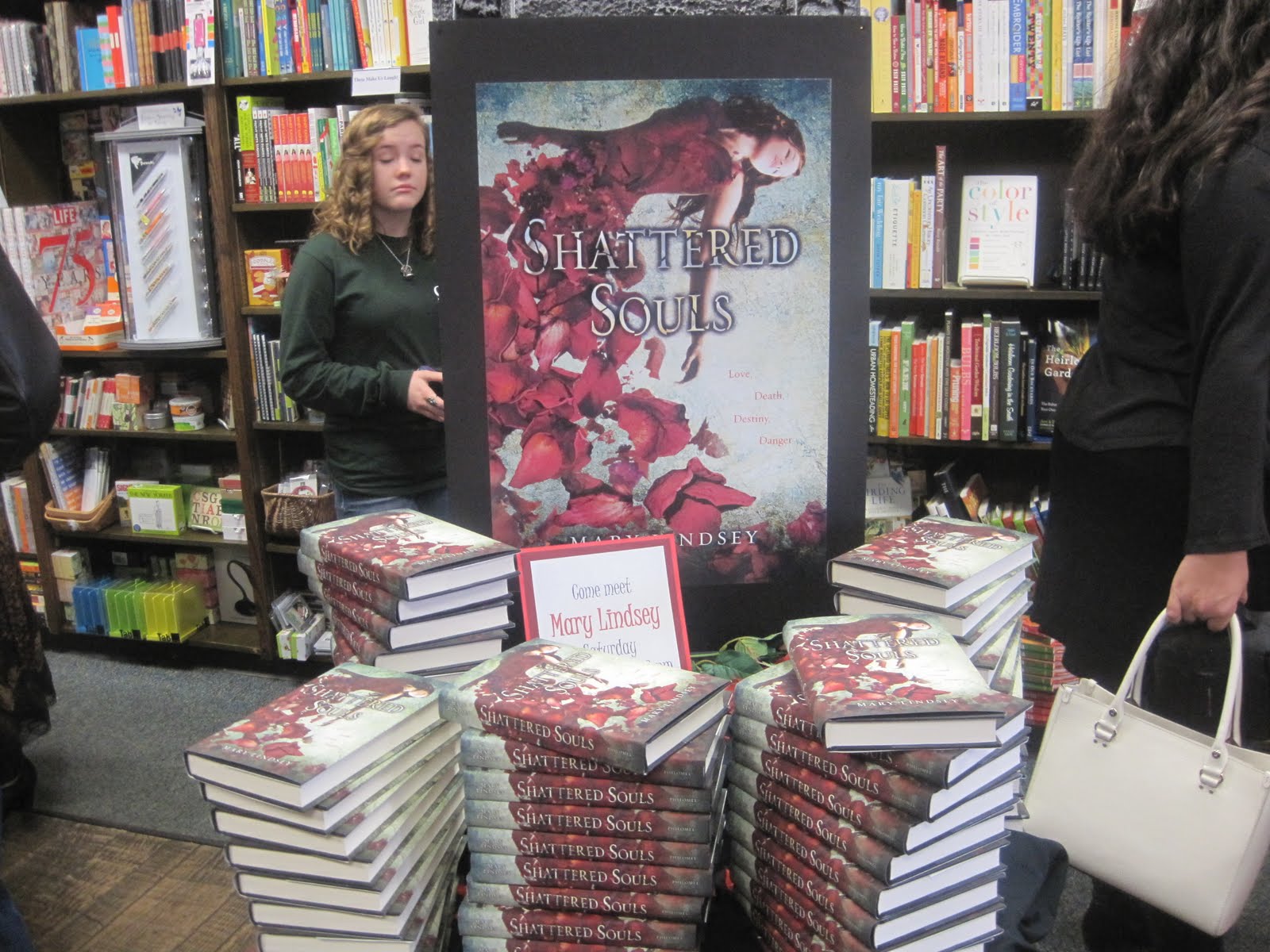 This past weekend took me back to Houston's Blue Willow Bookshop where I attended the launch party for fellow YAHouston writer Mary Lindsey, whose debut paranormal, Shattered Souls is out now. Lots of cheers and tears and smiles as Mary talked about her journey to publication, showed us the progression of cover art that ended up with the wonderful final cover, and took us through her revision process with her editor at Philomel, who definitely handed Mary a steep learning curve with an initial 14 page edit letter!