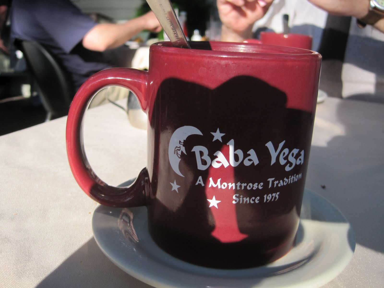 Well, they spell it a little different, but yes! it's the same Baba Yaga from Russian folklore and Dreaming Anastasia. So if you're looking for a restaurant built in an old house in the Montrose area of Houston - one with a witchy name and decent vegetarian fare plus burgers and a pleasant latte, stop on by. And then you too, can bring home your very own Baba Yega mug! (although you don't have to follow my full example and shamelessly plug your novel by handing the waiter a post card. But...
