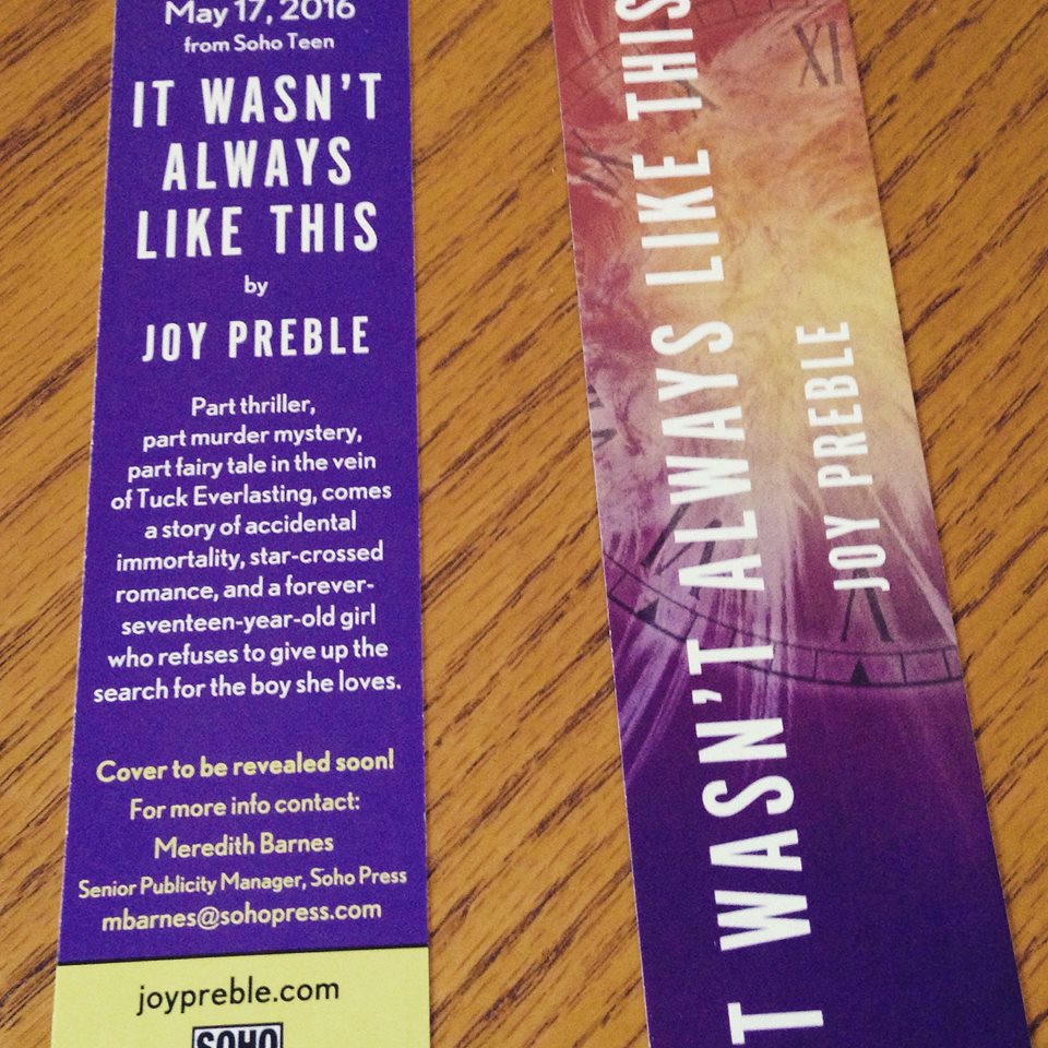 So Soho Press is still keeping the cover for next year's IT WASN'T ALWAYS LIKE THIS under wraps as best they can. ARCs are sneaking into the world to early readers/blurbers, and the come January to everyone else. But they approved these awesome bookmarks, created by my friend and writing partner Kristin Rae!