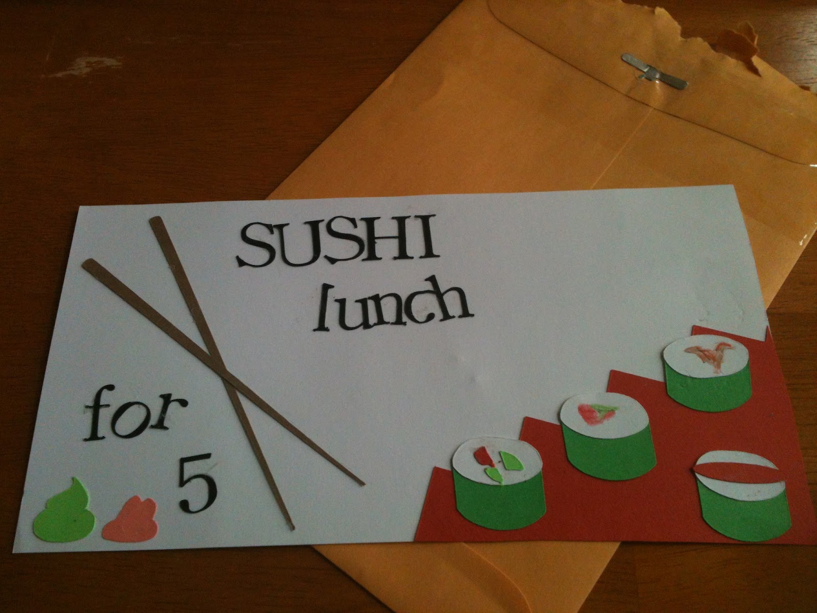 My care package: My daughter created six little care packages that I chose at random and mail to myself every 10,000 words. This week I get to go out for a sushi lunch. Can't wait!