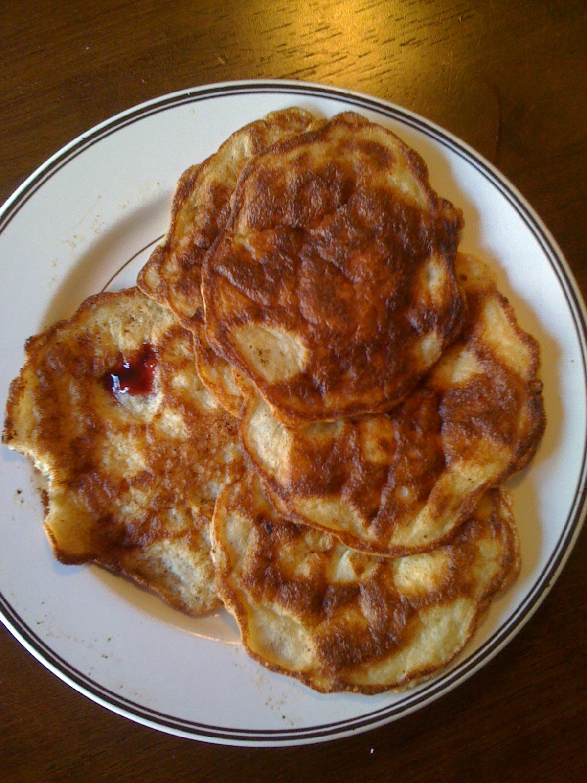 The "pancakes" tasted far worse than they look. It's 2011 and my mother is currently avoiding carbs. Since she couldn't find the special coconut flour required by the so-called pancake recipe, she ground her own coconut flakes into a gritty approximation of a flour-ish substance.