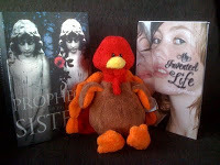 I've been especially thankful this year for my online friends (including you!). Navigating my debut year has much easier with the help of my friends from The Class of 2k9 and The 2009 Debutantes. So I'm giving away two books this week (and a turkey)! Prophesy of The Sisters is signed because I got to meet Michelle Zink in person. I'm still waiting to meet Lauren Bjorkman, but I loved laughing all the way through My Invented Life. I hope to meet her soon!