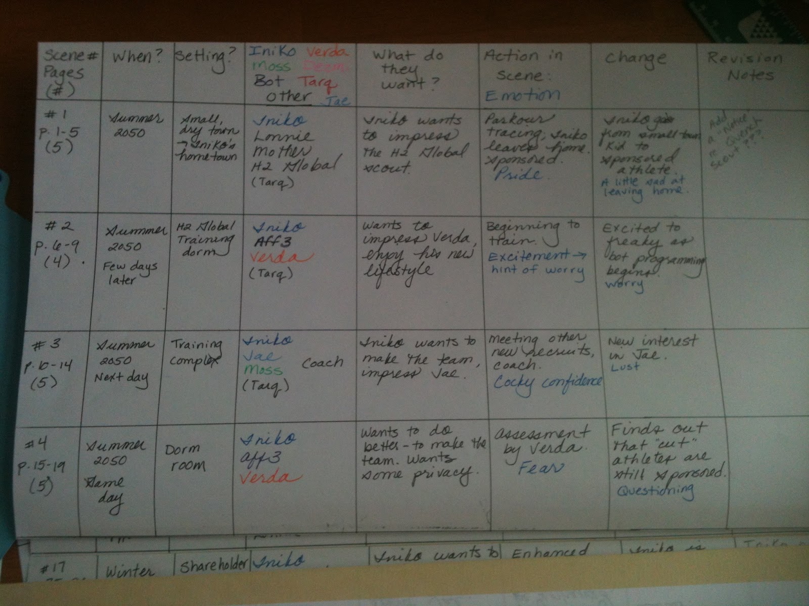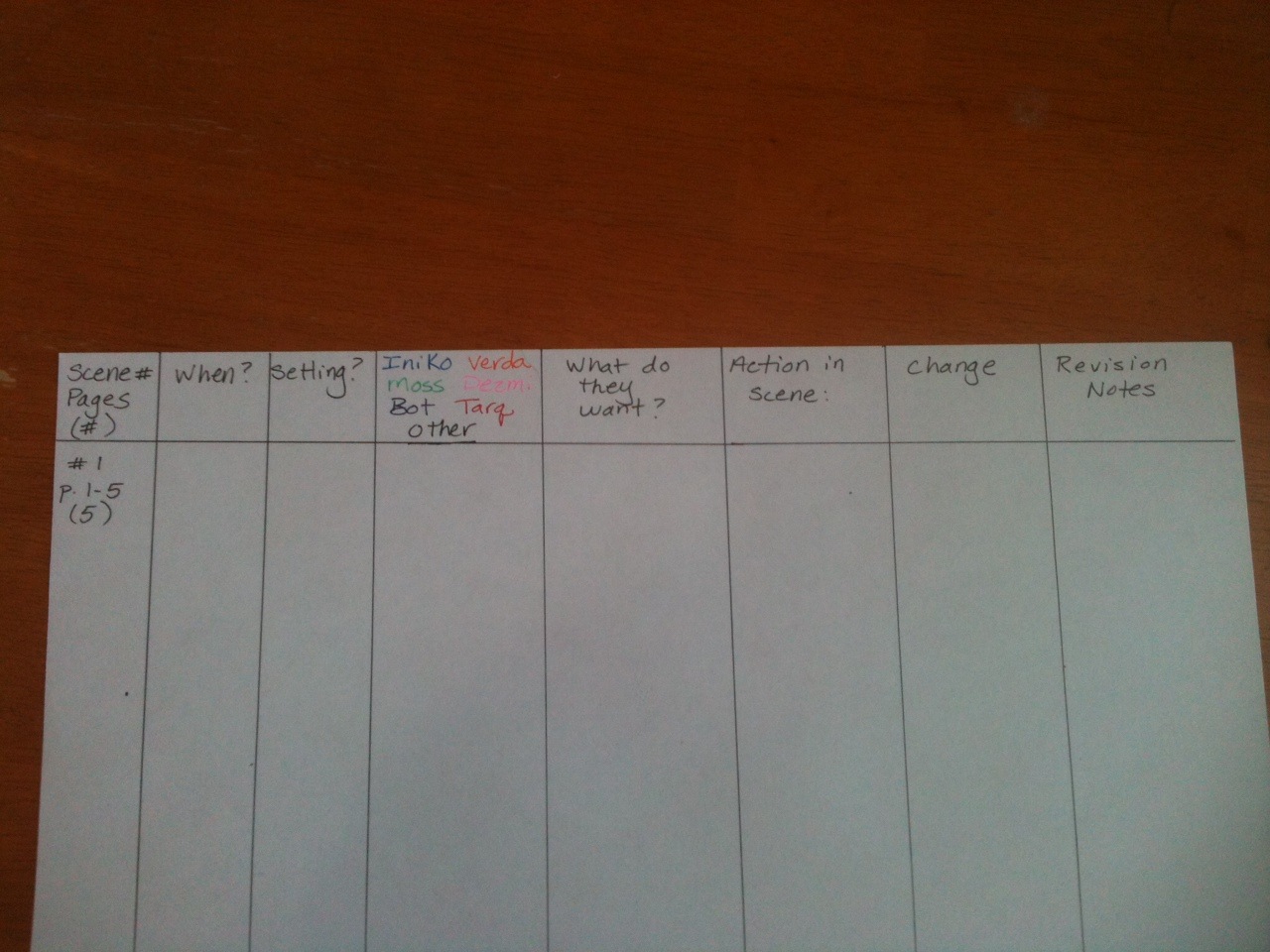 The categories are: scene#, pages, total number of pages (I combined these into one little box); when the scene occurs; the setting; characters (I assigned my main characters colors and listed them by name); what do they want in this scene; the action in the scene; change that occurs in the scene; revision notes.