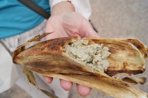 The main reason I went was to write about the food, which you just don't see anywhere else. Here's some "kneel-down bread"—ground-up fresh corn packed in a husk and roasted.