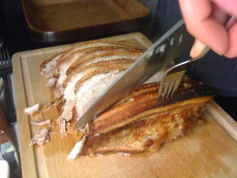 And then she bought the dinner: a giant pork loin-and-rib roast, with the skin still on and sliced thin–imagine a loaf of bread that has only been sliced down for the top inch.