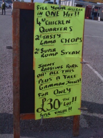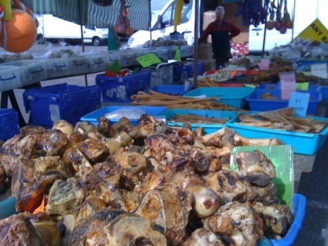 It's true–the British really love their dogs. This is a photo of a small area, and it doesn't show the vast size of the stand selling pet gear and food–a double-wide lot. And it wasn't the only operation at the market. In the village near us, where there isn't a real grocery store, there is a giant pet-supply shoppe.