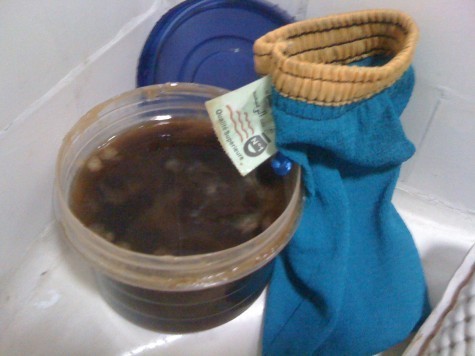 ghassoul Totally optional, but for the full hammam treatment, use this clay-like stuff to treat your hair. (Don't be tempted to put sabon baldi on your hair! It'll never wash out.) It's sold in small brownish chips, again in bulk. A standard-size bag of it is about 10 dirhams and will last for many washings. You make a paste with the ghassoul and warm water, then work it through your hair and let it sit for about 10 minutes. Then you rinse it out and shampoo.