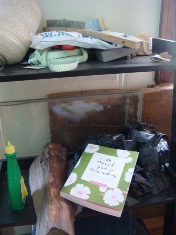 Just at the moment, I don't have free time to improve our whole house, I'm just briefly setting the book in the various trouble spots, ritualistically, hoping its magic will rub off and start to instill order. In our bedroom, which is a pit of organizational despair. Or over by the pile of half-finished sewing projects. Oh, or there, on that shelving that's the catch-all for crap on the second floor.