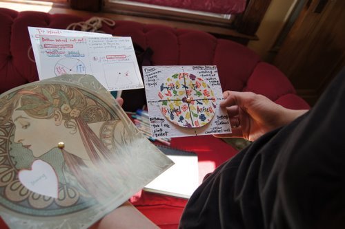 Since she left, we've managed to dry our tears a little, and although we haven't had a full-time steady person here, we have had a couple good visitors. The exemplary Kate Payne spent a couple of days here recharging mid-book-tour. (Check out her totally inspiring Hip Girl's Guide to Homemaking — more details in a bit.) She didn't wind up doing much writing, but she did intern with Peter on knot-tying (not what you think, people!), and to prep for her book event in Philly, she made some pretty cool chore wheels. (I'm proud to say she used our 7-inch of the "Dukes of Hazzard" theme song as a template. I mean, how else do you draw a perfect circle if you don't have records lying around?)