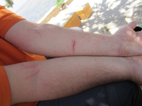 Peter's battle wounds from clambering up the hill. Also: holes in both our pants.