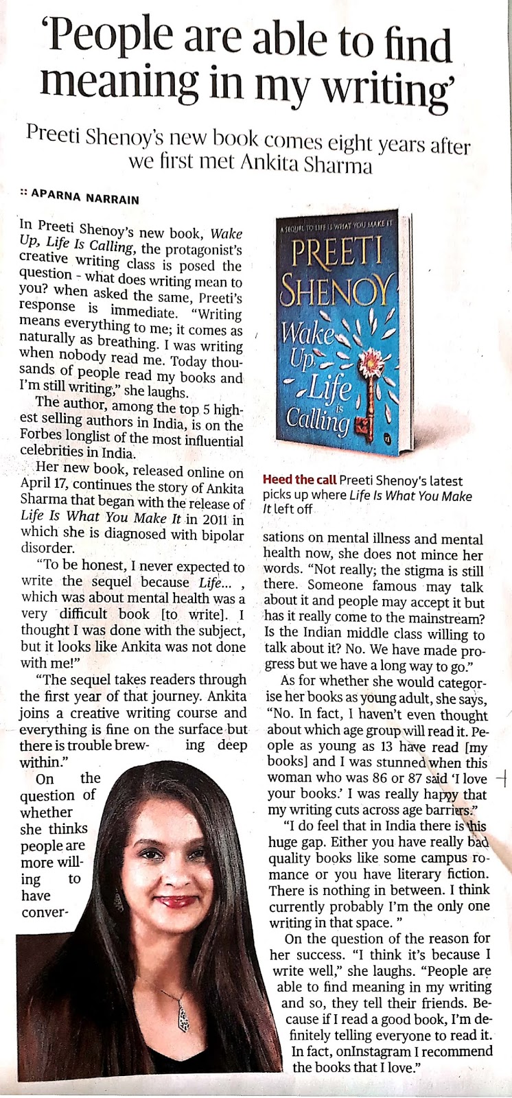 Hindu: https://www.thehindu.com/authors/people-are-able-to-find-meaning-in-my-writing-preeti-shenoy/article26922401.ece?fbclid=IwAR1UyJFvILB-CfWkXEEBQ4QuA4MmHppSrk6m-7qcOsdl6O8PjFJRTyKVoeI