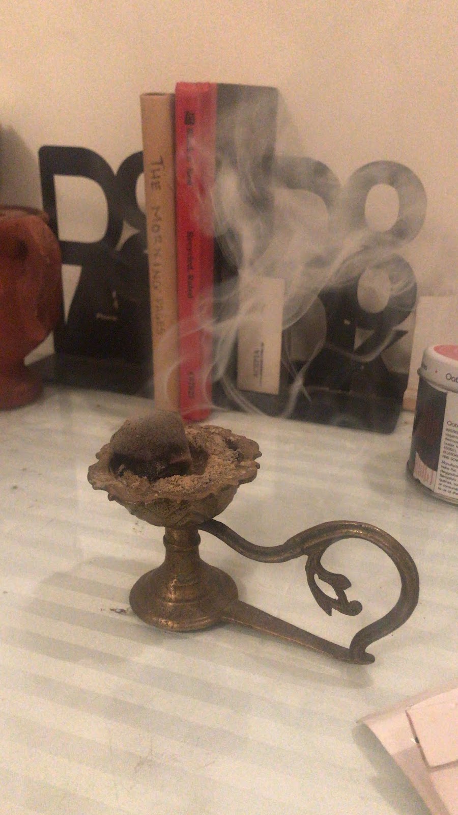 This is my antique sambrani holder. If you are allergic to the smoke or fragrance, use something that works for YOU. Smell is such an important thing in changing energies.