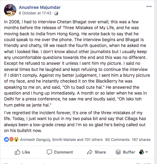 However, now after the latest series of allegations against him have come out, I am so glad, I have never been friends with Chetan Bhagat and never met him.