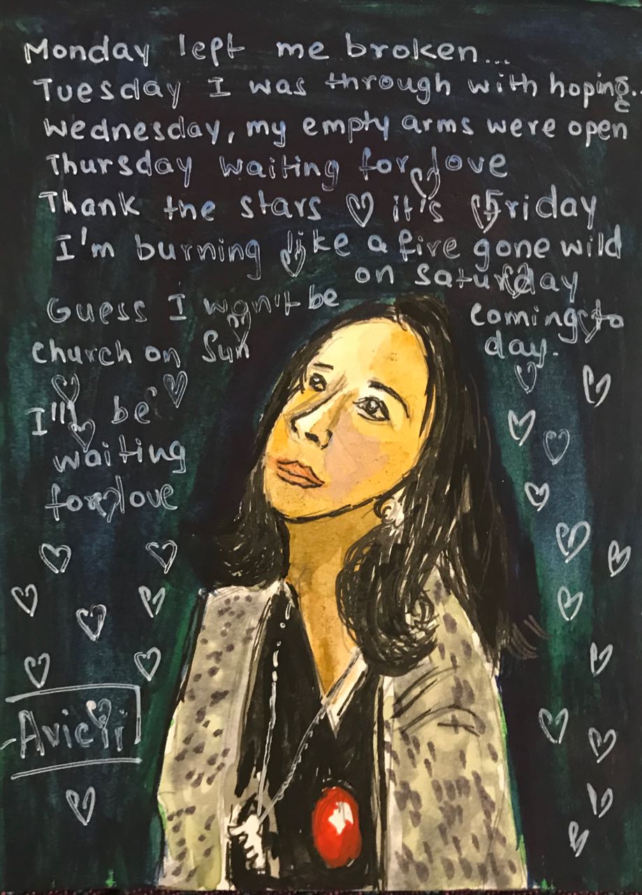 For today's portrait, we were asked to illustrate the background, and relate it to the model. To me the model appeared pensive and kind of sad, as though waiting for something or someone. I am fond of Avicii’s music, and I felt sad when he died. Thought this was a nice way to pay tribute to him. The background has words from his song “Waiting for Love.” I enjoyed making this one, and am quite pleased with it.