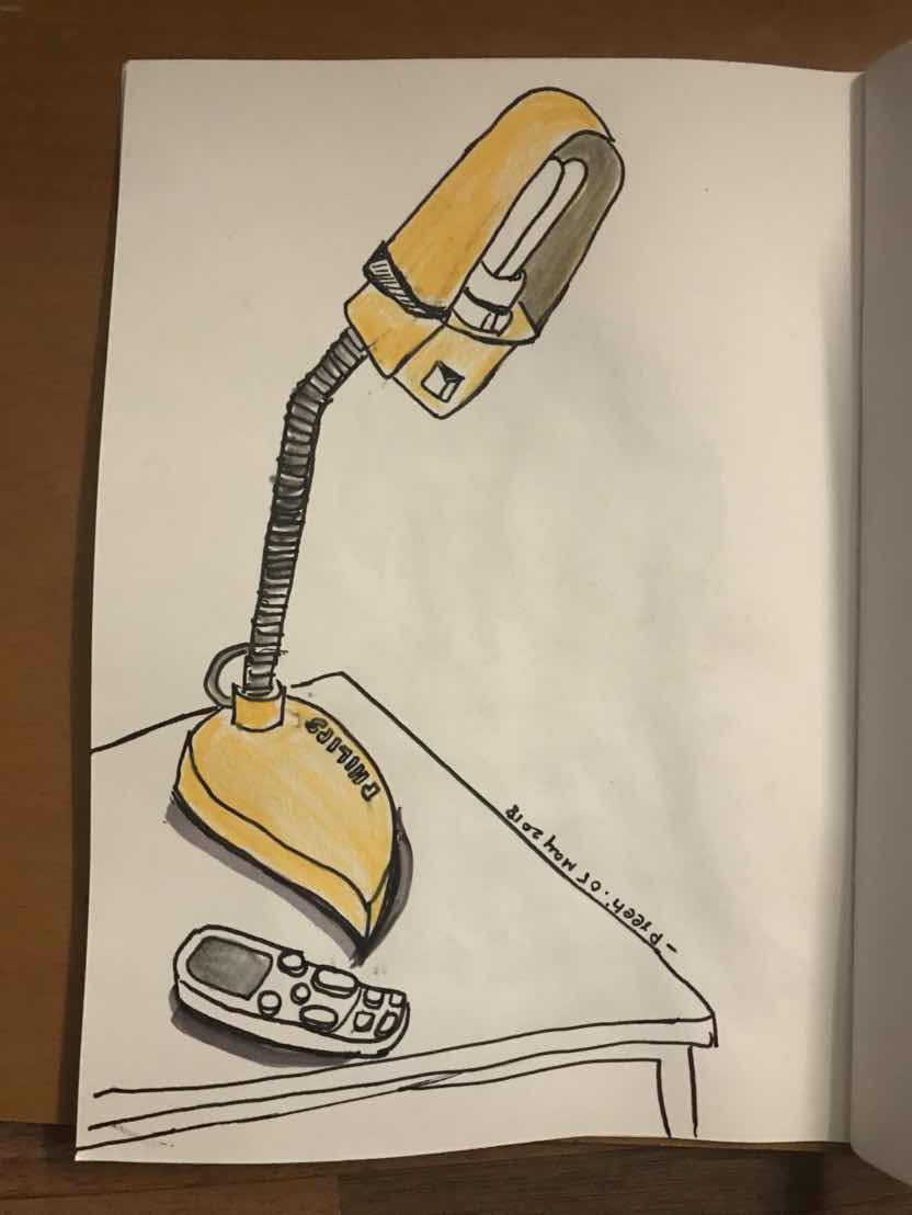 I was exhausted after the launch. But when I came home, I remembered the May Drawing challenge, where I have to draw a picture every single day, and post it. A challenge is a challenge, and so I got down to drawing. I drew my bedside reading lamp today. Here's my drawing.