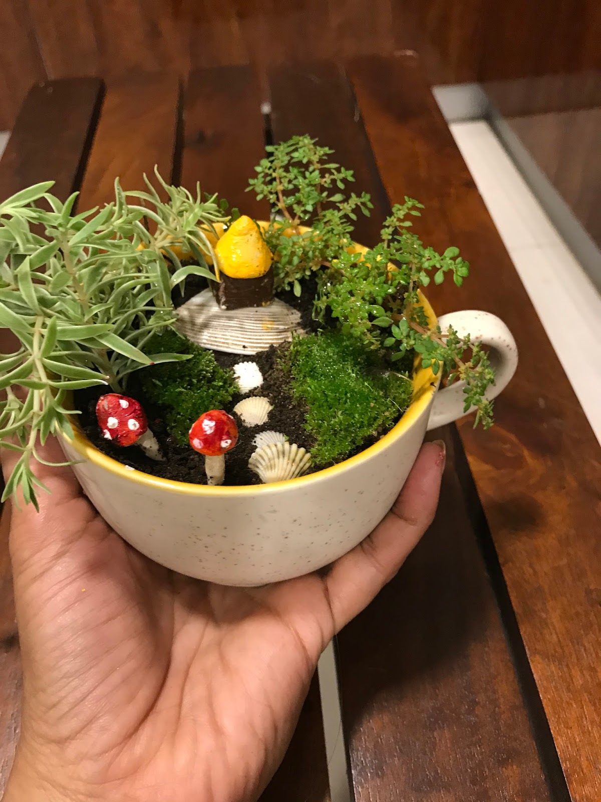 I made the mushrooms, and the house with clay! Then I painted it :)