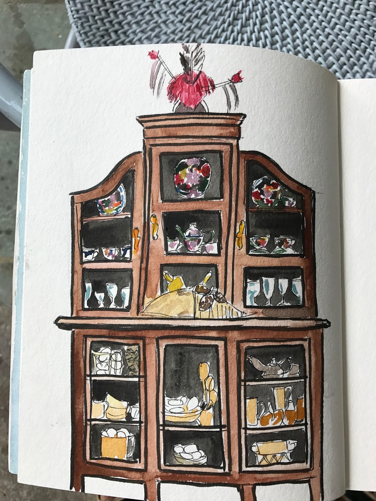 I sketched this morning, when a beautiful antique cupboard caught my eye, at the resort where we are staying. Here's what I painted.