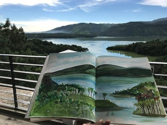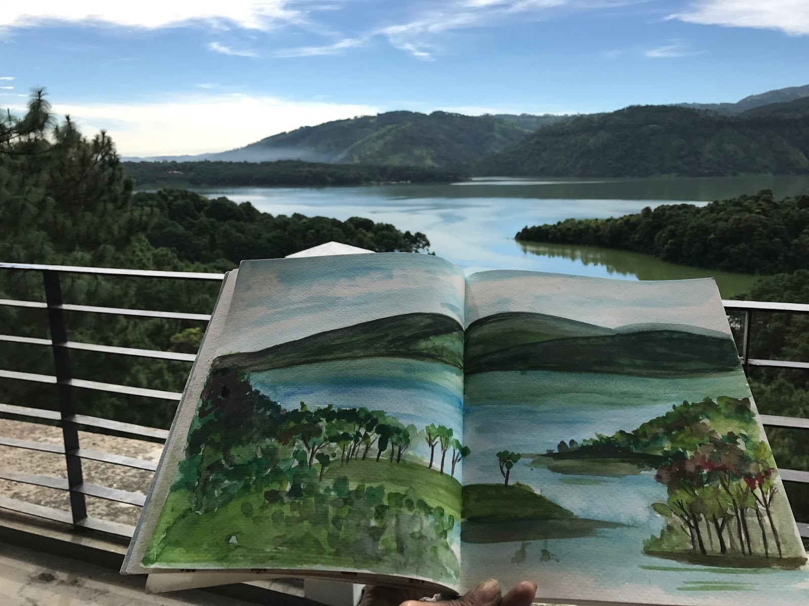 We climbed back, contented happy souls. We found a vantage point from where we had a view of this very lake that we had trekked down to. I stood there and made a painting.