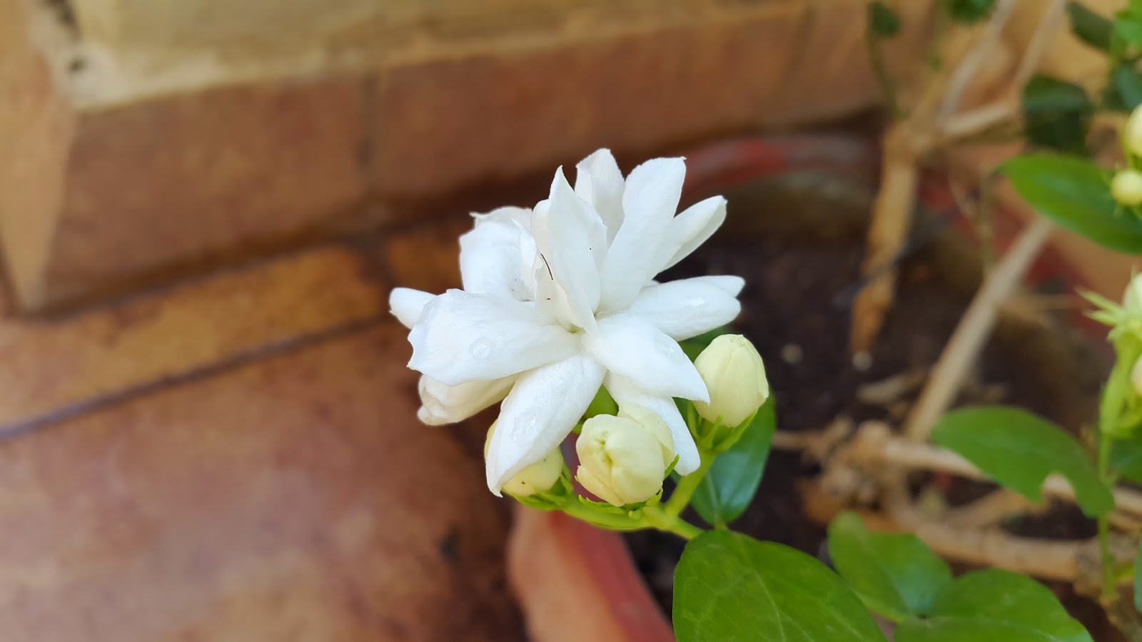 Close up of a single jasmine flower. My jasmine always blooms when it rains. The fragrance is a whiff of heaven.
