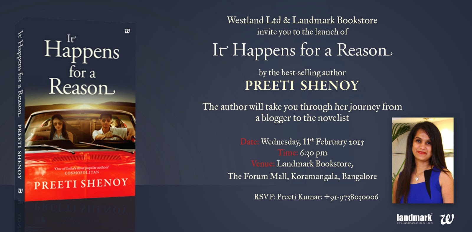 If you are in Bangalore, drop by at Landmark on Wednesday, 11th Feb at 6.30 pm. I will be there. It is going to be an interactive session and you can ask me questions and I will answer. I will also be talking about my journey from an unknown blogger to where I am today :) I do believe #ithappensforareason !