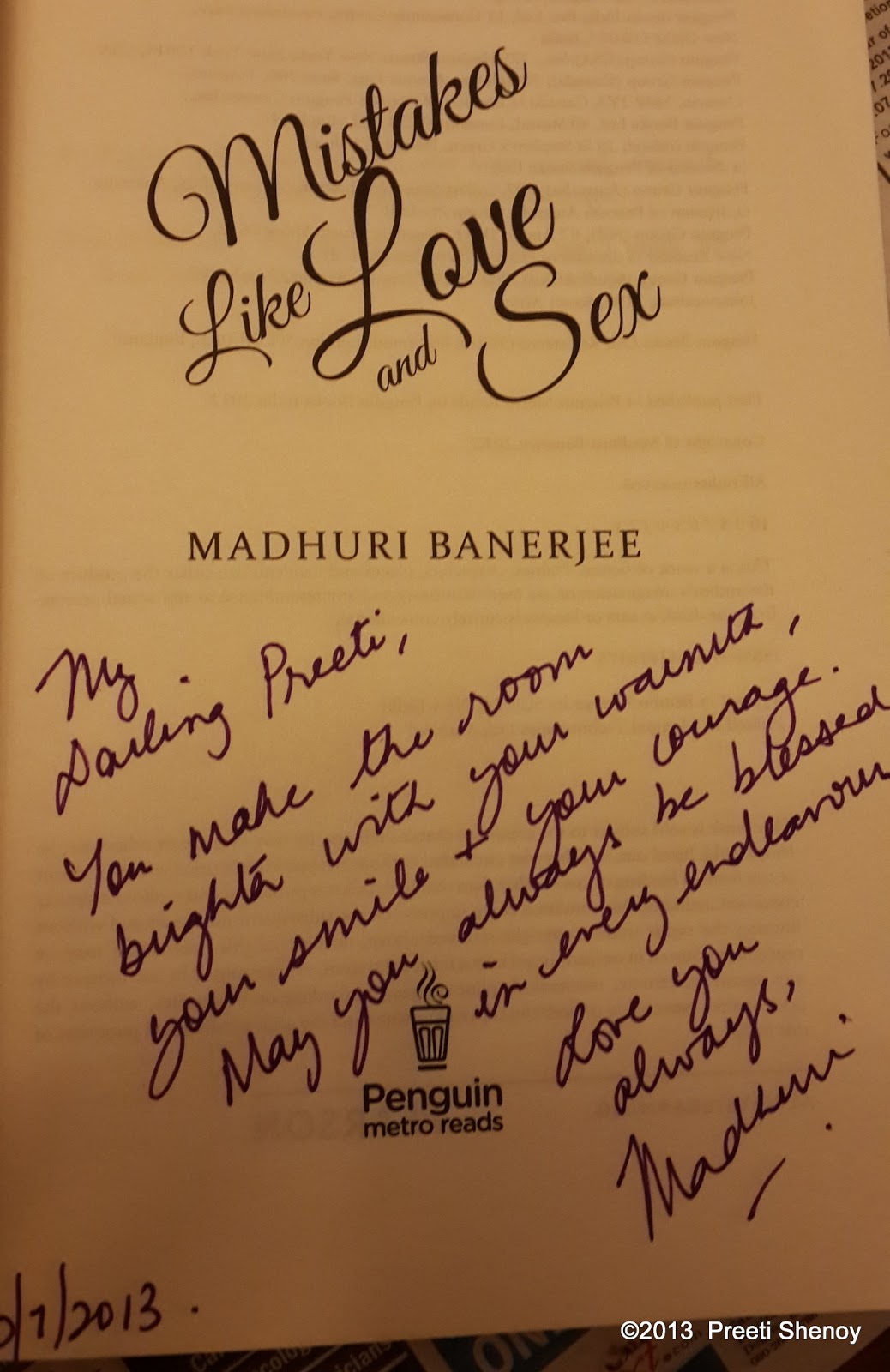 I had read Madhuri's 'Mistakes like love and sex' and I told her that the sex scenes in the book were sizzling! She has done a splendid job on them. We talked about how it is really hard to write a good sex scene, without making it sound like porn, and without ever referring to genitalia. I was telling her about how the reader has to experience every single emotion that the protagonist feels, and therein lies the strength of the book--and she agreed.
