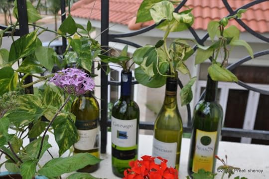 Can you see the wine bottles in the back ground? You can easily grow money plants in your empty wine bottles. All you need to do is rinse them thoroughly and top them with water. Now place cuttings of money plants (take care to remove the leaves from the bottom) into the bottles and keep the water topped up every three or four days. (Hold it under running water till the water flows out and gets filled with fresh water. Also wash the leaves).