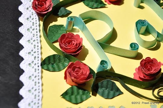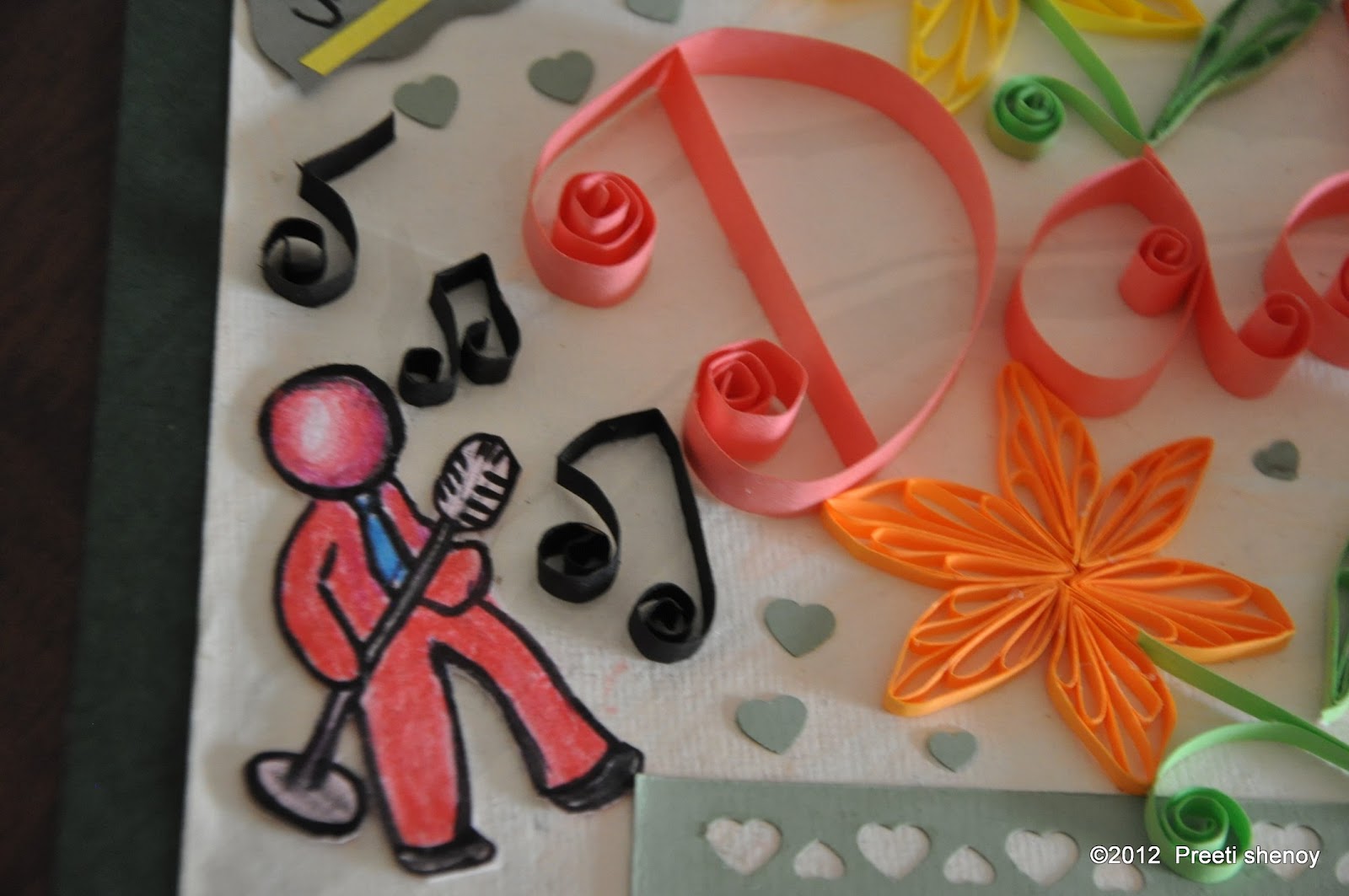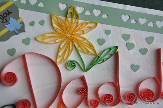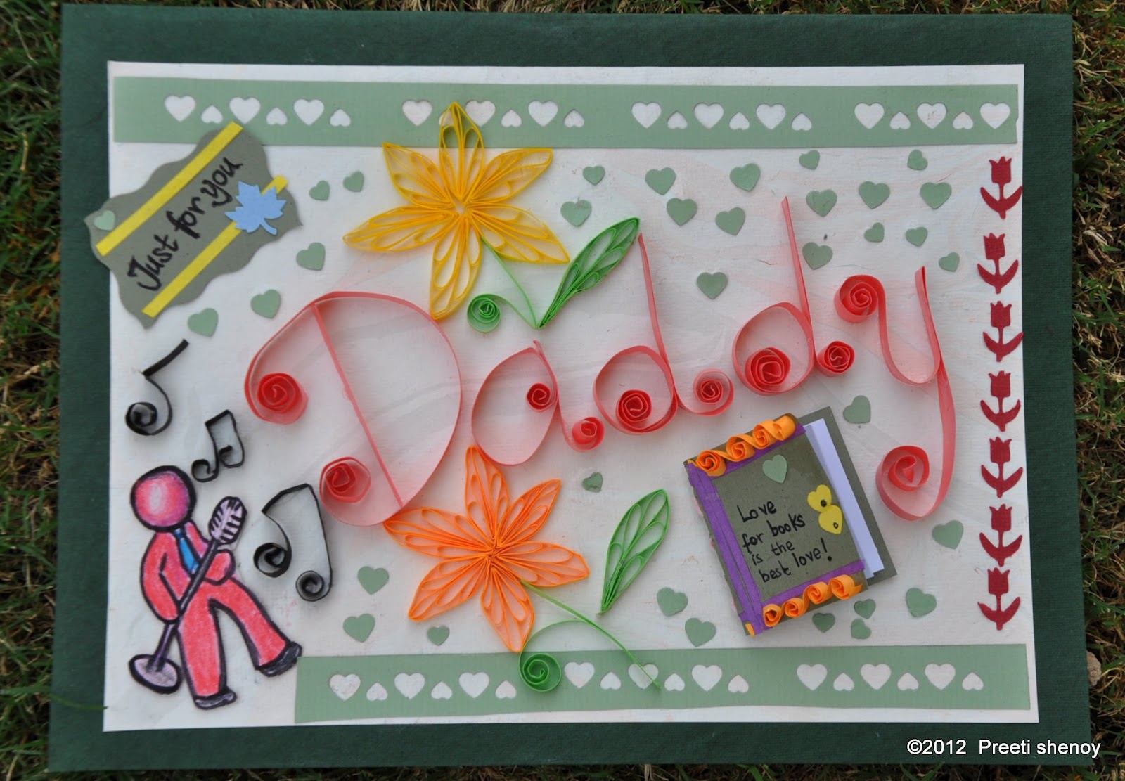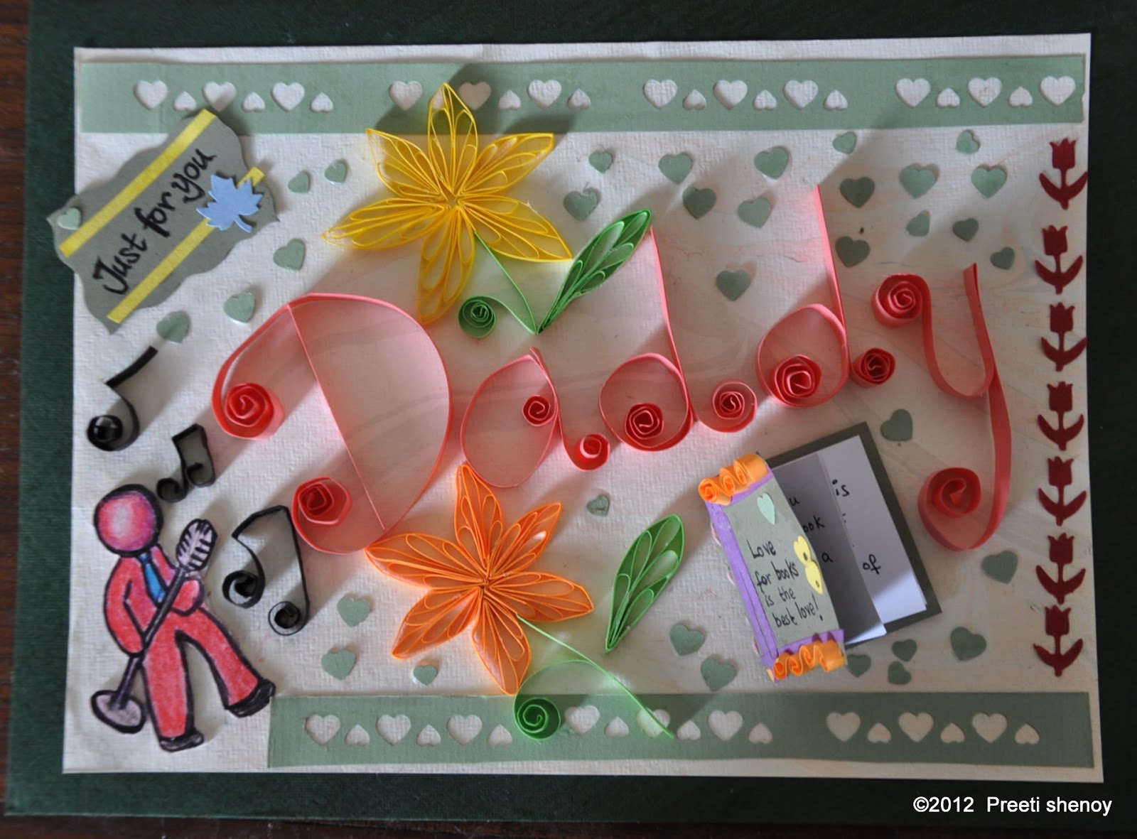 Then there was this card which was ordered by a person for his father. He said his father has been invited by All-India Radio a couple of times to sing and so the card should have musical notes. He also said that his father loves to read and so can I incorporate something which shows that into the card. He also wanted the quilled letters to say "Daddy".