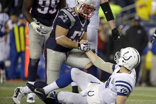 Still, when it turns fall, and the excitement builds as each team believes they are going to do better this season, and tail-gating takes off, and the bands rev up I feel the old pleasure from a long time ago. With all that, there is one thing, to me, that is the most attractive thing on that football field and it's something I wish we could see more of, something I wish the coaches and parents would think is more important...and that is...a show of good sportmanship. Whether it's putting in your "twos" when the score is 45 to zip, or no late hitting when you're frustrated because you're losing, or even just the helping up of an opposing player. Yeah, when one player helps up a player on the opposing team, that is THE most attractive thing! Of course, I realize they may not be saying something nice. They're probably saying, "Come at me again and I'll knock you down again..." (I cleaned that up, lol.) But I like to picture in my rose-colored world, that they are doing what Andrew Luck is thought to be doing.... paying a compliment to the player for a great effort.