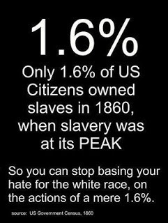 There is a mind set that every "white man" in America owned slaves. This is some of the indoctrination that is currently being taught in our “progressive” schools, developed after the model of Hitler’s educational system. They (the system) pretend to teach this in an effort to undo the pain that was caused by slavery. But there is a much more sinister reason, with race-baiting at its core. Though it sounds as if they are all up in arms, due to their love of mankind, over slavery back in the 17 to 1800's, it is actually just the opposite. They are promoting hatred. Hatred of the white man for offenses supposedly committed by their ancestors. Blame whitey. That is their cry. Always blame "whitey!” Well, only 1.6% of all U.S. citizens owned slaves at the height of slavery in 1860. "A very small number upon which to base the hatred of the entire white race."