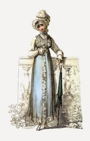 PROMENADE DRESS. A CELESTIAL blue or French grey silk skirt, buttoned and trimmed down the front with a full border of lace, gathered on a plain heading, terminating at the bottom with a deep flounce of the same; high-drawn body, made either of sarsnet or India muslin; long full sleeve, confined at the wrist by a bracelet of blue satin bead and emerald clasp. Lace ruff round the neck.
