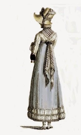 An evening primrose-coloured French sarsnet petticoat, trimmed round the bottom with a double border of clear muslin, drawn full with a narrow ribband of corresponding colour to the petticoat; high body of jaconot muslin, with reversed drawings; long sleeve, drawn to correspond. A silk ruff.