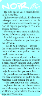 For years now I've been a regular contributor to Spanish satirical magazine El Jueves. In late 2010 I began publishing a series of super short stories under the title Noir. They built upon detective fiction clichés (the dramatic sunlight through closed blinders, the laid-back private eye narrating in the first person) allowing me to skip through the descriptions and jump into the jokes. I guess I'd been reading Raymond Chandler at the time and wanted to try it. They looked like this.