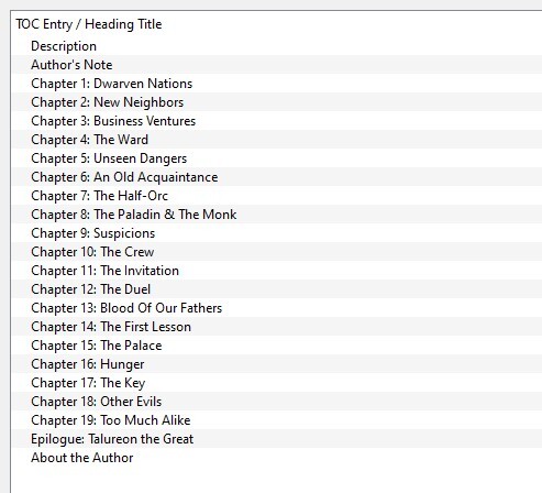 I am now far enough along with the editing to share the Table of Contents from HALF-ORC PALADIN.