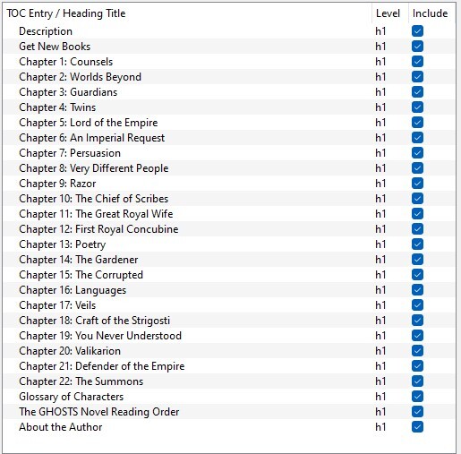 We are far enough along to see the Table of Contents for GHOST IN THE VEILS, which should be visible below!