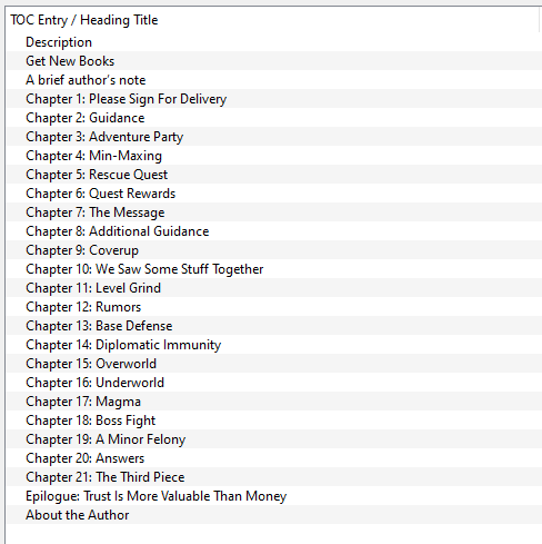 I am finally far enough along to share the Table of Contents for SEVENFOLD SWORD ONLINE: LEVELING, which you can see below. The book ended up at 21 chapters. Hopefully it will come out next week if all goes well.